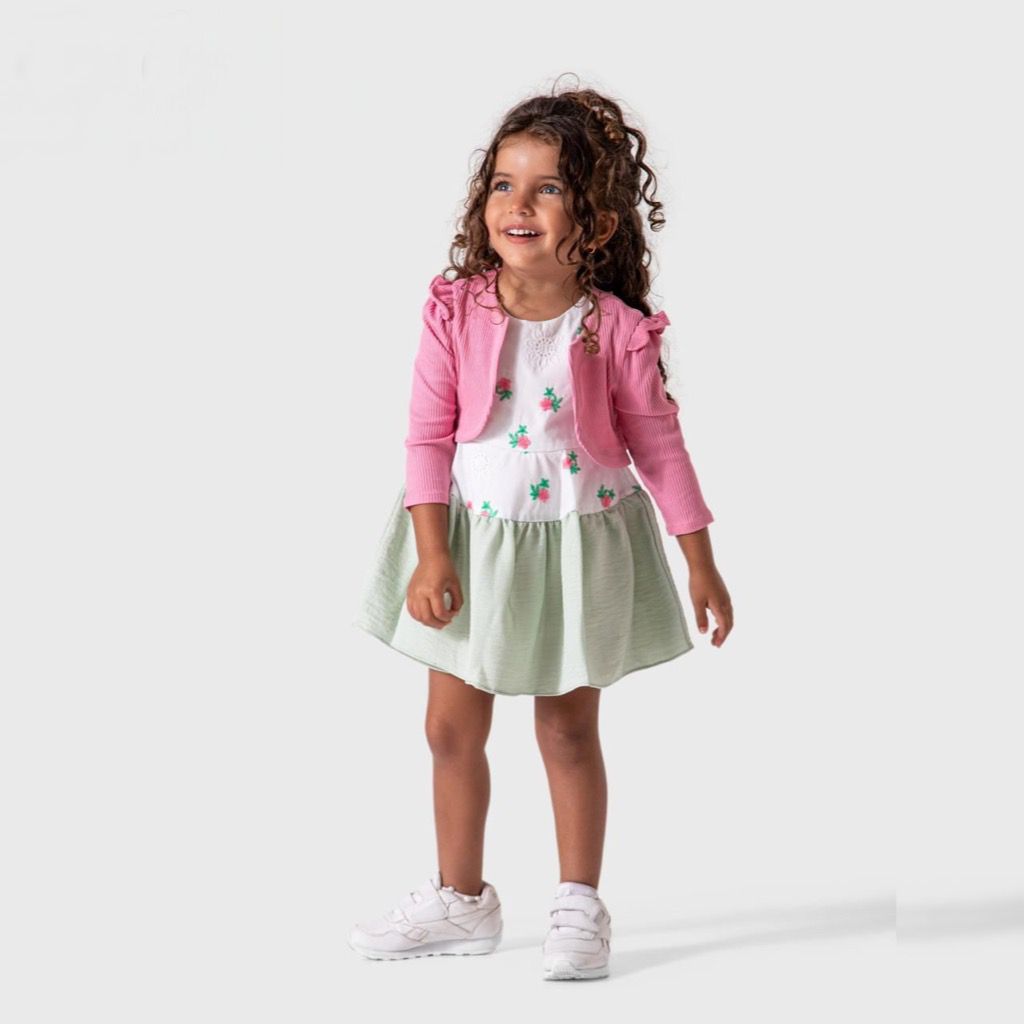 A delightful outfit that combines sweetness and style. The white floral dress with a light green skirt brings a fresh, playful charm, while the pink ruffled cardigan adds a soft, elegant touch. Perfect for casual outings or special occasions, this set keeps your little girl looking adorable and feeling comfortable all day long.