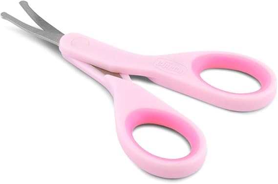Chicco New Baby Nail Scissors in Pink, carefully designed for safe and effective nail care, these scissors feature stainless steel curved blades with rounded tips for maximum safety. Ergonomic plastic handles with rubber inserts provide a comfortable and secure grip, and the included protective cover ensures hygienic storage. Suitable for babies from birth up to 36 months and completely nickel-free for sensitive skin.