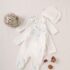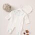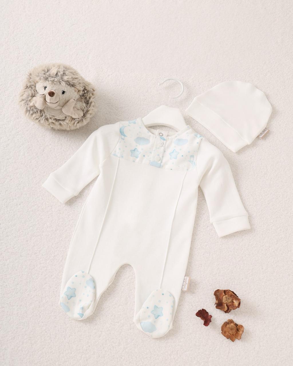 This elegant footed romper offers a sophisticated “mock two-piece” aesthetic, combining the polished look of a coordinated set with the effortless functionality of a single garment. Meticulously crafted from premium, ultra-soft cotton, it ensures maximum breathability and a gentle touch against a newborn’s delicate skin, making it an ideal choice for all-day comfort. The pristine white bodice is beautifully contrasted by a sky-blue panel across the chest and matching footies, featuring a delicate celestial print of stars and moons that radiates a timeless, serene charm.