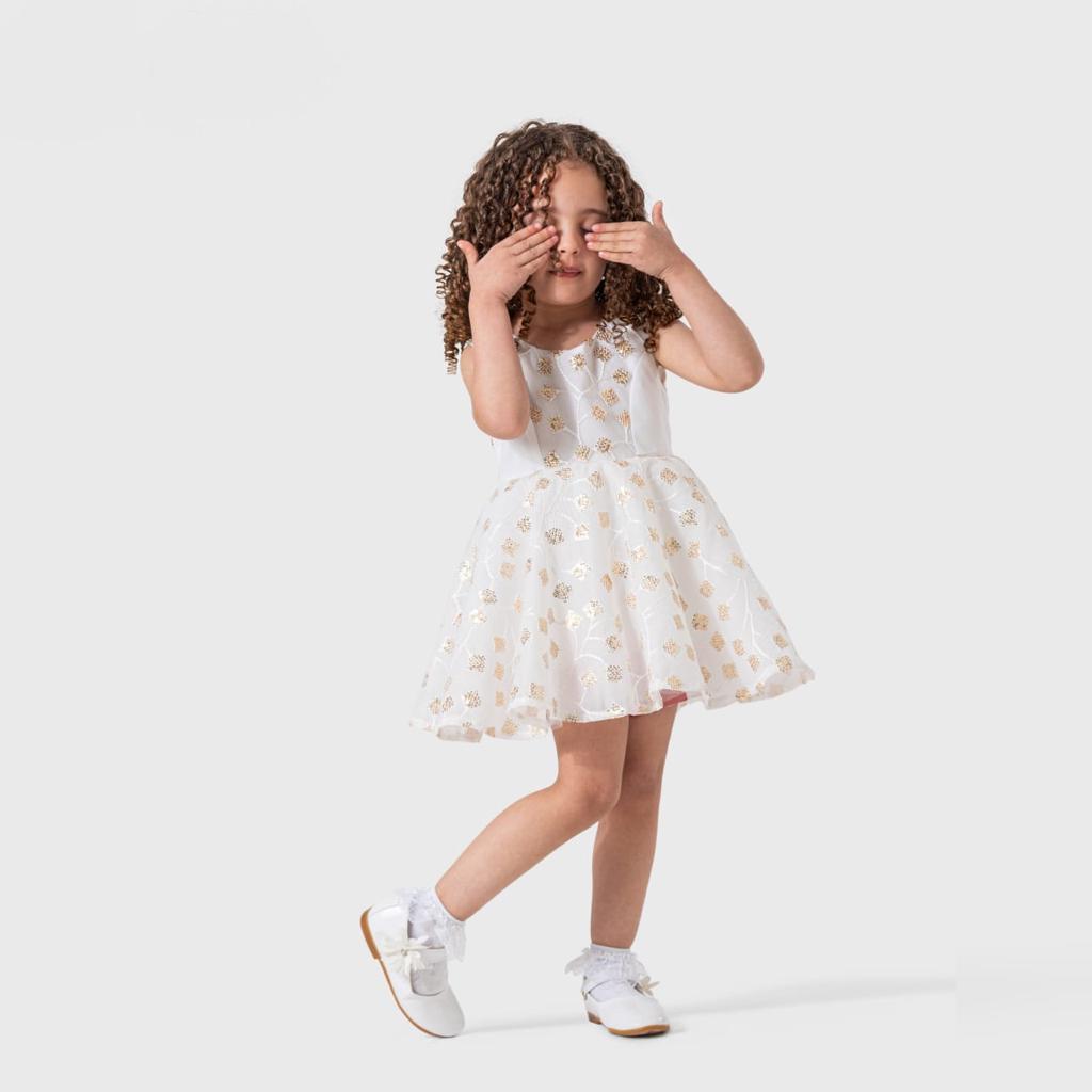 Make your little girl shine with this elegant off-white dress adorned with delicate golden embroidery that adds a touch of luxury and charm to every occasion. The sleeveless design and flared skirt create a graceful, playful silhouette that’s perfect for twirling.