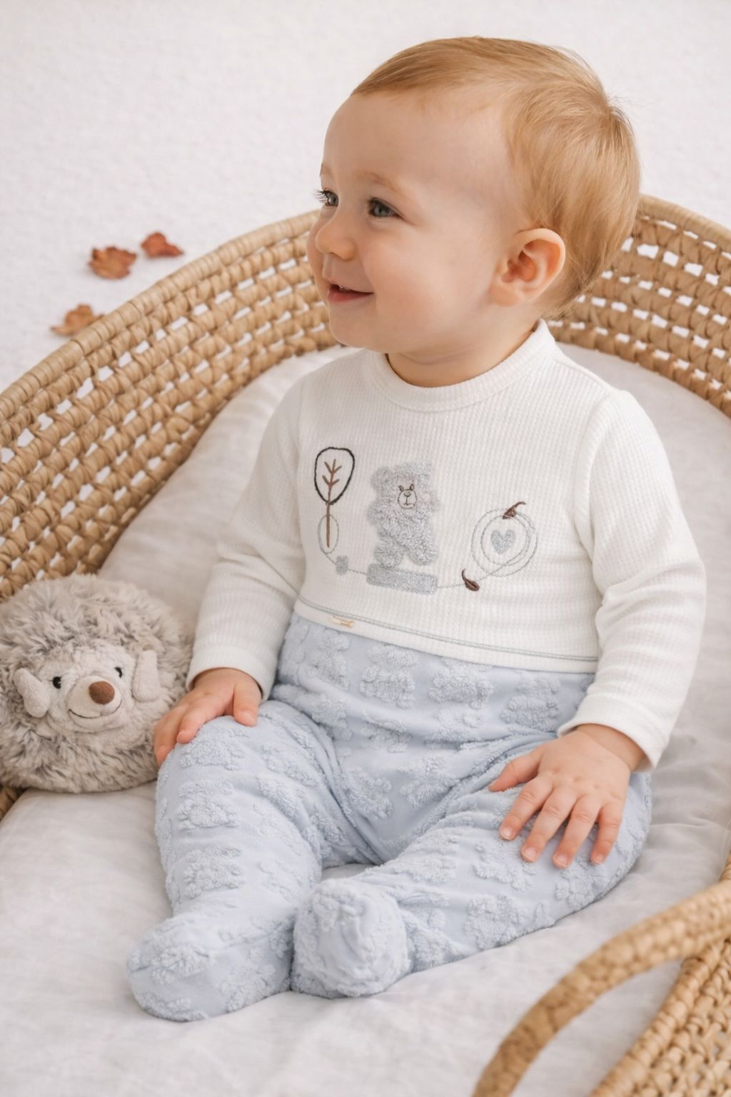 A perfect blend of modern minimalism and timeless charm, this one-piece romper features a soft grey lower half with an elegant, embossed teddy bear texture. The upper white section is accented with fine embroidery that adds a touch of innocent whimsy to the overall design. Tailored from high-quality, ultra-soft cotton, it provides a gentle embrace for a baby’s delicate skin, ensuring they stay cozy and comfortable throughout the day. With its integrated footies and practical snap closures, this romper offers a polished look and functional ease, making it a standout piece for any occasion.