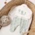 This charming one-piece romper offers a delightful blend of texture and style, featuring a soft mint green base with an embossed teddy bear pattern that adds a unique tactile feel. The clean white bodice is beautifully detailed with a delicate embroidered scene of a bear and a tree, creating a serene and playful look for any little one. Crafted from premium, breathable cotton, this footed romper ensures maximum comfort and warmth for sensitive skin. Designed with practicality in mind, it includes easy-to-use snap fasteners for quick changes, making it an essential and stylish choice for a newborn’s first wardrobe.