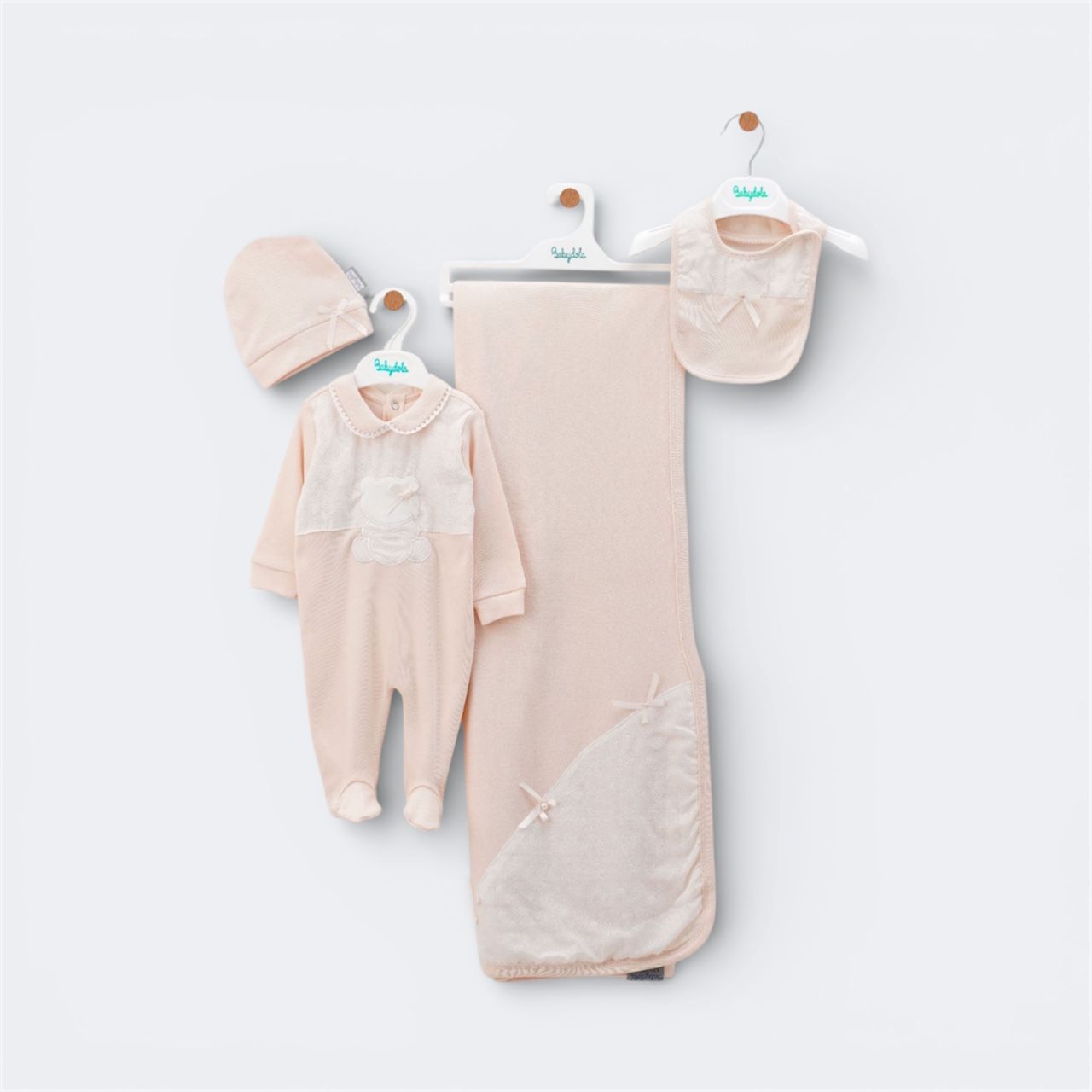 This exquisite 4-piece newborn gift set offers the ultimate blend of elegance and comfort for a little one’s first days. The collection includes a beautifully tailored footed romper featuring a delicate lace collar and an embroidered teddy bear, a matching soft beanie hat, a premium receiving blanket with satin bow accents, and a coordinated bib. Crafted from the finest soft-touch fabric, each piece is designed to be gentle on sensitive skin while maintaining a sophisticated look. Whether for a hospital homecoming or a special gift, this coordinated ensemble provides a timeless, luxurious aesthetic that celebrates the arrival of a new baby with style and grace.