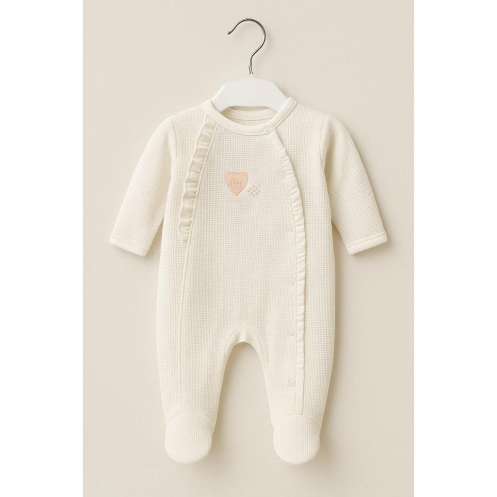 The neutral, calm color gives a clean and elegant look, complemented by a small, sweet chest detail that adds charm without being too bold. The footed design helps keep tiny feet warm, making it perfect for sleep, outings, and everyday wear.