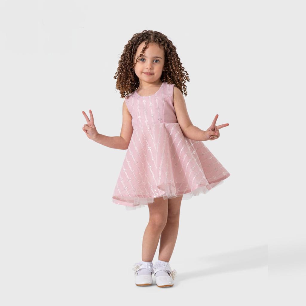 Add a touch of sparkle to your little girl’s special moments with this elegant pink dress. Designed with shimmering patterns on soft tulle, it offers a perfect mix of charm, comfort, and elegance. The sleeveless cut and flared skirt create a graceful, playful silhouette, while the soft inner lining ensures all-day comfort.