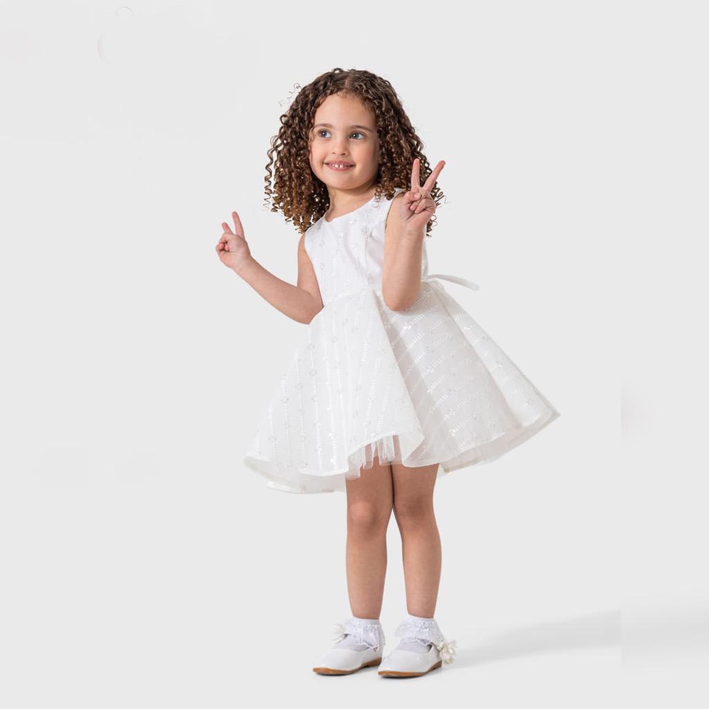 Let your little girl shine with elegance in this beautiful white dress. Designed with delicate embroidery and a layered flared skirt, it offers both charm and comfort for any special occasion. The sleeveless cut and soft inner lining ensure ease of movement, while the shimmering fabric adds a magical sparkle with every step.